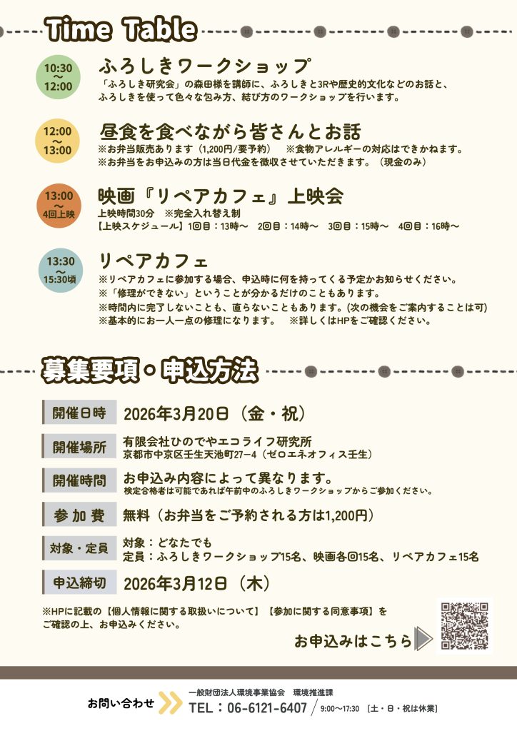 2026年3月20日(金・祝)に、一般社団法人環境事業協会様の主催でリペアカフェと映画『リペアカフェ』の上映会をやることになりました!今回のリペアカフェでは、うるしの室を持って来ていただくので、木工製品にうるしをふくこともできます。午前中にはふろしきワークショップも開催!さあ、どんな修理がやってくるのか、また賑やかな1日になりそうです。